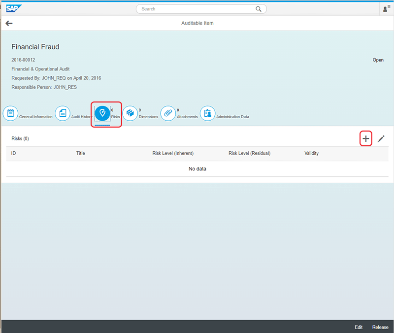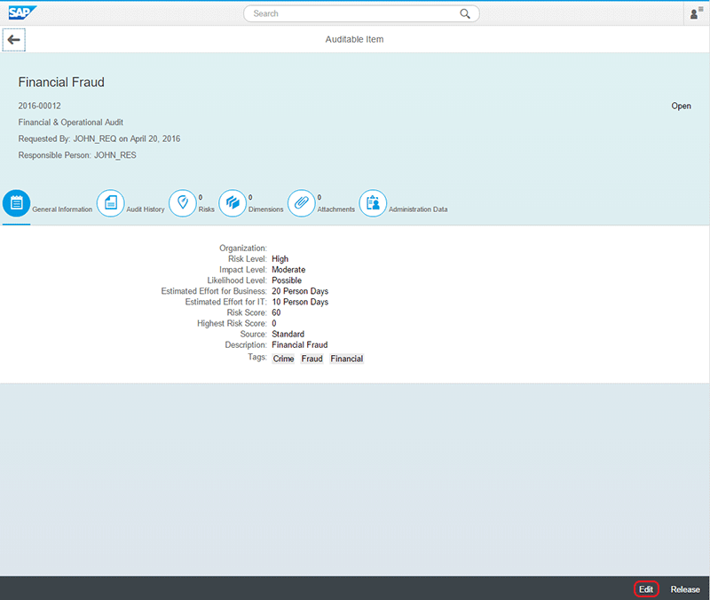 Following the creation of an auditable item, you might want to maintain additional attributes for the auditable item. To do this, click the Edit button and navigate to the Risks tab as shown in Figure 6.