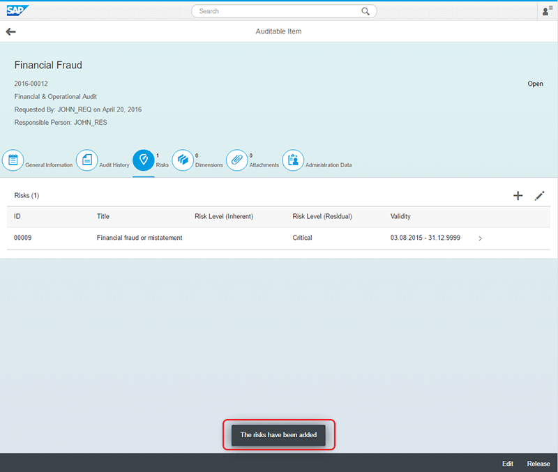 Before an auditable item can be assigned to an audit, it has to be released. To release the auditable iem, click the Release button and you receive a status message confirming the release.