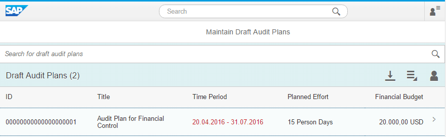 Following the successful creation of the audit plan, you may need to maintain the definitions of the audit plan by assigning business objects such as risks, dimension, auditable items, and audits. To maintain an audit plan while still logged on as the Audit Manager, choose the Maintain Draft Audit Plan tile and Figure 17 displays.