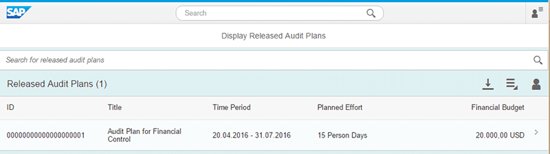 For the purpose of this article, I release the audit plan by choosing the Release button and a screen (not shown) displays with a confirmation dialog box. Click the OK button and the message The audit plan has been released displays. To access all the released audit plans, choose the Display Released Audit Plans tile in the SAP Audit Management UI and Figure 22 displays.