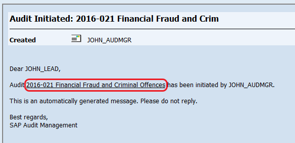 After an audit has been initiated, it moves to the audit preparation phase. At this stage, the audit lead typically needs to prepare a work program for the audit. The work program helps define the methodologies, detailed procedures, and test steps that will be adopted during the audit exercise. You can access the initiated audit item in the Prepare Audit tile. Alternatively, you can configure the system to allow notification to be sent to the actor (audit lead in this business example) via emails as shown in Figure 29, which is accessible by choosing the applicable message (not shown) via transaction code SOST in this case.