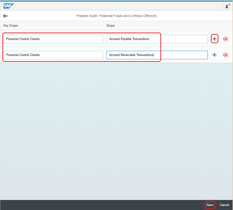 It is possible to copy a work program from another audit using the copy option. When you copy a work program, the associated risks, controls, and procedures are also copied. You can also add new key scopes and scopes manually. Click the edit icon and in the screen that displays, enter values for the Key Scope and Scope fields as shown in Figure 31. Use the add (+) option to add additional entries.