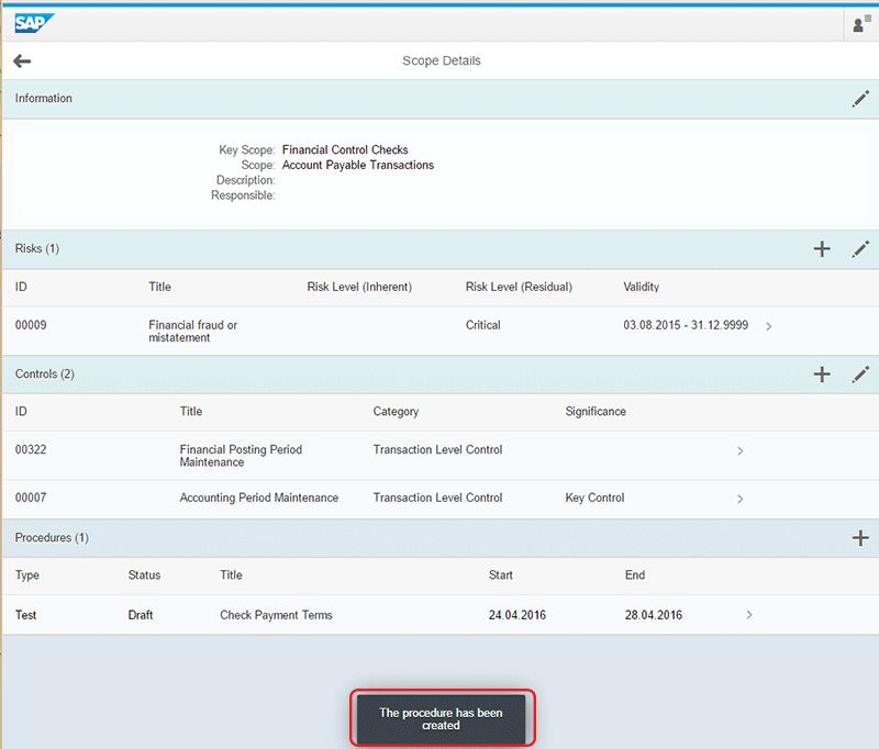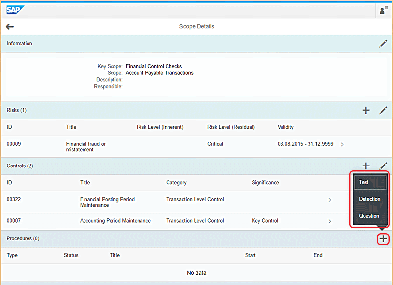 Audit procedures are developed and carried out by auditors to gain assurance about the success (or failure) of an audit based on comprehensive evidences gathered during the audit. SAP Audit Management supports different audit procedures including test procedure, questionnaire, and automatic detection tasks. Detection tasks represent an integration capability with SAP Fraud Management because they can be assigned and scheduled to run automatically to pick out abnormalities in business data. The test procedure allows you to define the controls to be tested while creating comprehensive test steps to evaluate compliance (or otherwise) with defined controls. The questionnaire allows you to prepare a list of questions with predefined answers to select with the option to provide comment. Choose the add (+) button in the Procedures section and Figure 36 displays with the possible audit procedures. (The system was designed so that the procedures are in the Controls section. That is because of the size of the browser, the options do not fit into the Procedures section.)