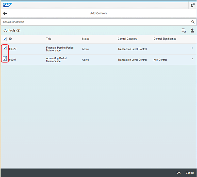 Choose the add (+) button in the Controls section to assign the controls that you want to test to the procedure. Figure 40 displays with only the controls that are associated with the work package scope where you can select the controls to add to the procedure.