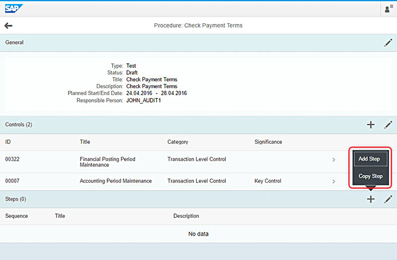 Observe that there is an additional option to copy test steps to the procedure if a control that has a test plan is imported from SAP Process Control. Click the Add Step button and in the screen that displays, enter values for the title and description as shown in Figure 42.