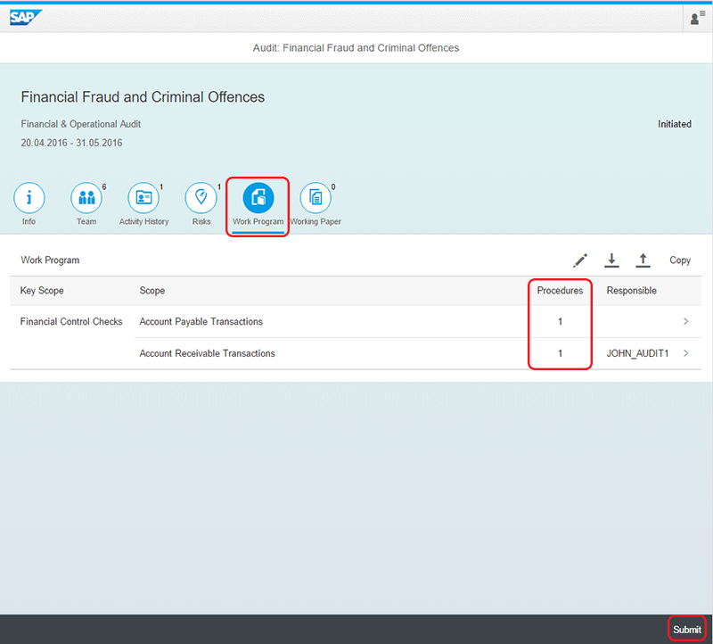 Choose the link in the body of the mail. In the log-on screen (not shown) that displays, enter the user name and password and the system takes you directly to the Work Program tab of the audit as shown in Figure 30. The key activities in the audit preparation phase are the development and documentation of the audit work program by the audit lead aimed at achieving the audit engagement objectives. The audit lead sets up the structure (key scope and scope) of the work program, defines the detailed procedures for the audit, and submits it for the approval of the audit manager before commencing the audit.