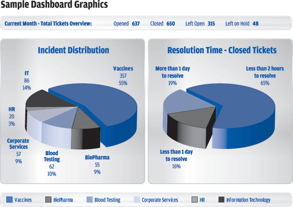 Simple dashboard graphics help illustrate IT incident resolution. The data used for these graphics is hypothetical.