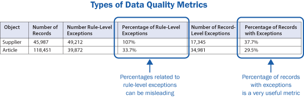 - Record-level exceptions — These metrics are helpful when looking for a high-level view of problem areas, because one record may have multiple rule-level exceptions (Table 1).