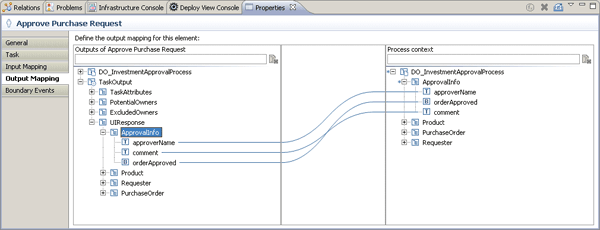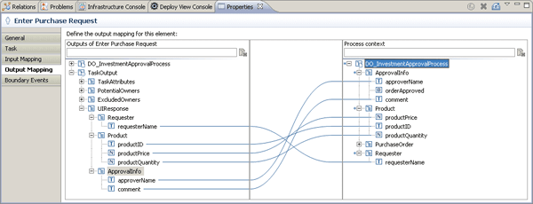 Now switch to the output mapping. The process context is now on the right side of the mapping area whereas the fields of the activity appear on the left (Figure 10). Assign Requester, Product and ApprovalInfo by using the Map automatically feature. You can find the structures of your activity beneath the TaskOutput > UIResponse node. Do not use the fields for the DO_InvestmentApprovalProcess node, which also appears on the left side of the mapping editor.