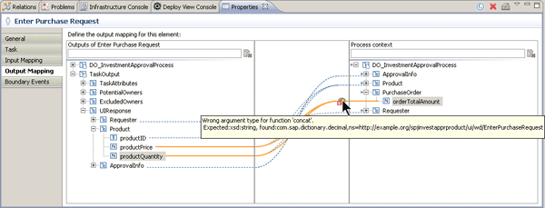 One last step is missing. In the process context, you reserved a field named orderTotalAmount to contain the total amount of the order. It’s calculated by multiplying quantity and the product’s price. Select both fields on the left side and drag and drop them on the orderTotalAmount field. When the fields are connected, you can see a circle indicating that a function has been included automatically to combine the two fields. In addition you can identify an error marker attached to the circle. Move your mouse pointer over the error and you receive the error message “Wrong argument type for function ‘concat’”(Figure 11).