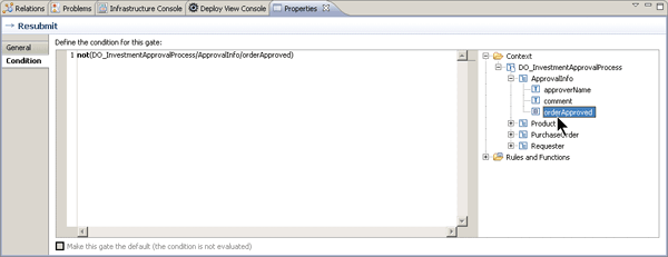 Next, define the condition for the Resubmit branch by selecting it in your process model. This gate should be activated as soon as the purchase order has been rejected by the approver. To create the formula for this condition, drag the predefined function “not” into the editor and enter an opening bracket. You can find the “not” function beneath the boolean node of the Rules and Functions folder. Next, drag the process context field orderApproved after the opening bracket (Figure 17).