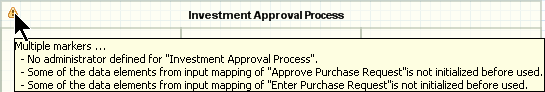 After the process composer screen opens, you still see the error marker in the process header. Move the mouse pointer over it to get a list of open tasks you have to do to make the process executable.