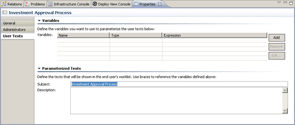Next click the User Texts button which you will find straight beneath the Administrators button. The dialog allows you to define a text that will be shown during runtime as a link which can be used to navigate to the process model. When clicked during runtime, the process flow diagram is shown to the end user with the current step marked with a green icon. This allows end users to orient themselves within the process. By default the text reads New Pool 0. Replace it with Investment Approval Process (Figure 19).