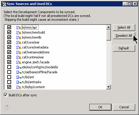 If the dialog shown in Figure 20 appears, click the Deselect All button and continue by clicking the OK button. The dialog wants to synchronize all the used development components. This is not necessary for this example project, so proceed as described.