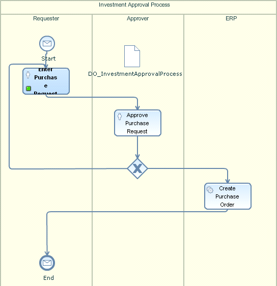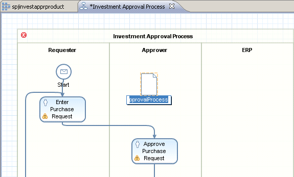 I am close to the end of my demo scenario as described in my two earlier articles. All the pieces are now available, so I am going to glue everything together to an executable process within the process composer. After closing all Composite Application Framework (CAF)-related windows, you are once again back in the Composite Designer. This time, you only use it for navigation. Double-click the process symbol for the Investment Approval process and the system guides you to the process model within the process composer (Figure 1).
