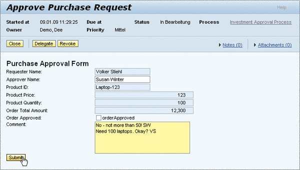 The Comment field contains the conversation between requester and approver. Adjust the fields accordingly and click the Submit button. Confirm the dialog informing you about the successful completion of the current task. After refreshing the UWL, navigate to the Approve Purchase Request activity again.