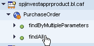 Call the Service Browser by entering the URL https://<server>:<port>/caf and clicking the Service Browser link. Inside the Service Browser window is a section named CAF applications on the left side of the screen. Look for your project and expand the PurchaseOrder node beneath your project’s name. Your PurchaseOrder business object provides a findAll method (Figure 28).