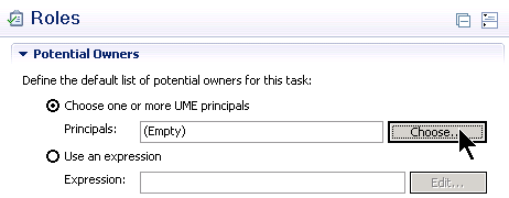 To set the user or group of users who are allowed to handle this task, switch to the Roles tab strip. In the Potential Owners section click the Choose… button to assign concrete users, roles, and groups to the task (Figure 3). To assign users, select User from the Principal name drop-down menu (Figure 4). If you know the name of the user, you can enter an appropriate search string. In this example, you want to assign the demo user. Enter demo (or any other user name of your system who has execution rights for business processes) into the search field and click the Search button.