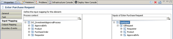 Start with the Enter Purchase Request activity. Select it in the process flow and click the Input Mapping button on the Properties tab. You see a mapping area, where the fields of the process context appear on the left side and the fields of your activity on the right side (Figure 7).