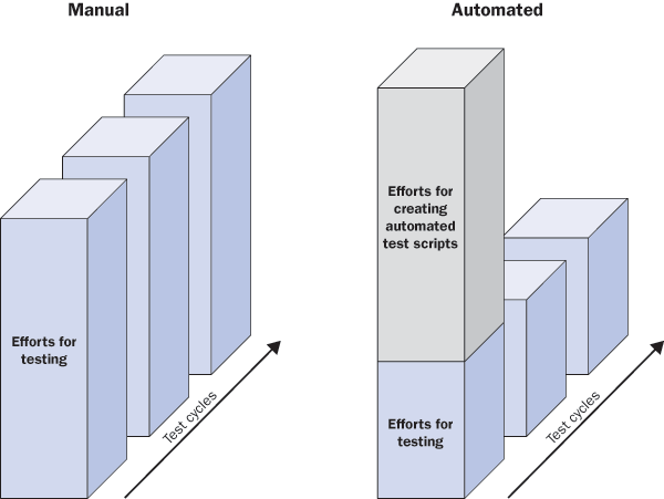 Figure 1 shows a comparison of efforts associated with manual versus automated testing. Efforts associated with the manual testing remain essentially the same every time you perform testing during multiple test cycles. Using automated testing, the efforts may be higher in the beginning, especially to build the library of test scripts. Next time, when you want to do testing, you only need to put forth effort for processes that changed. You reduce overall testing efforts over multiple test cycles with automated testing.