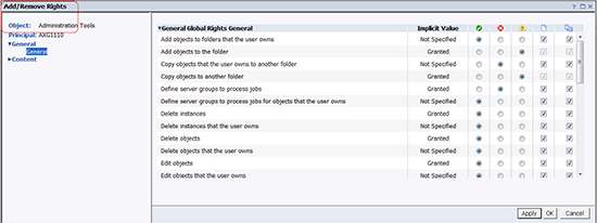 By clicking the Add/Remove Rights link in the Advanced tab, an administrator can grant or deny individual rights to a user or group or apply the rights to objects or sub-objects. A separate window opens to permit these actions (Figure 10).