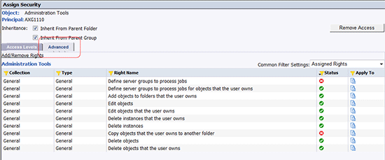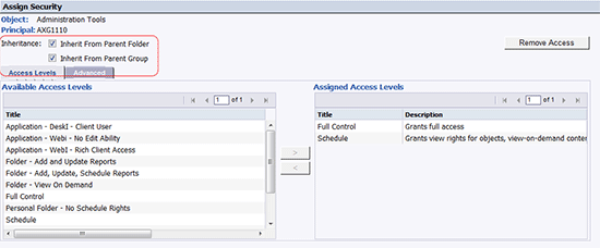 Inheritance can defined for a parent folder or parent group for all of its children folders and objects by checking the appropriate box in the Assign Security window (Figure 11). A company can have security conventions based on both group levels and folder hierarchies.