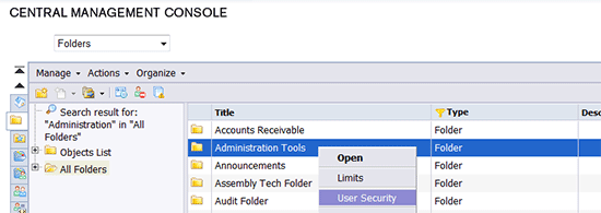 - Expand the Objects List folder on the left to get a list of objects to choose from, or expand All Folders to get a list of folders to choose from. Locate the object or folder whose rights you want to modify, right click on the object or folder, and select User Security in the context menu (Figure 3).