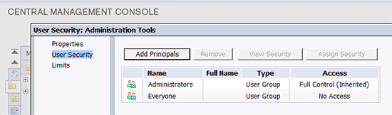- To add security for principals (i.e., users or groups) that do not already appear, click the Add Principals button. Subsequently, the Add Principals screen launches, allowing an administrator to add users or groups with the arrow buttons (Figure 5).