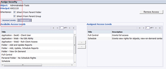 - To designate an access level for a user or group, return to the User Security screen and click the Assign Security button (Figure 6). The Assign Security screen launches and allows you to set access levels or advanced security for the selected user or group using the corresponding tabs and arrow buttons (Figure 8).