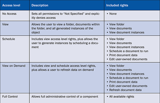 BusinessObjects comes installed with a number of predefined access levels: no access, view, schedule, view on demand, and full control. BusinessObjects also enables administrators to develop advanced or custom access levels.