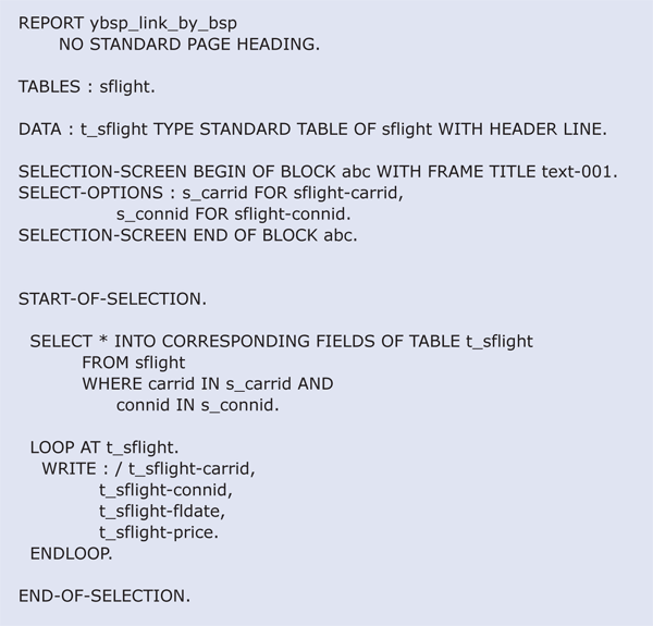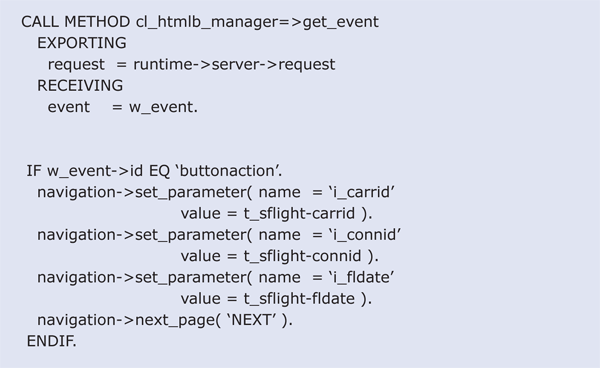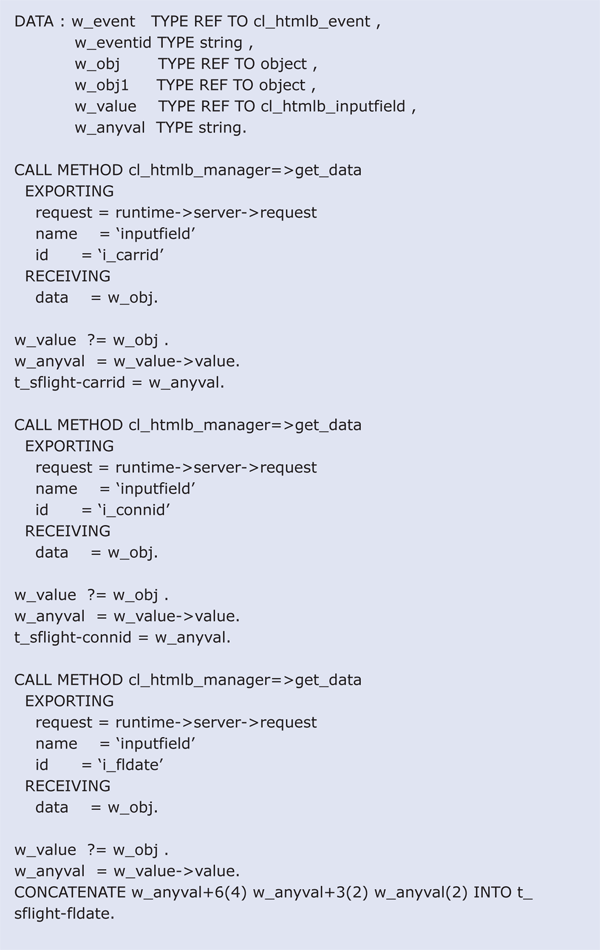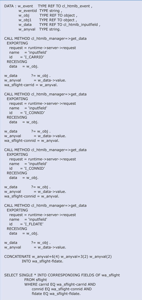 Add the code in Figure 9 to the OnInputProcessing event. In this code, you tell the system to fetch the values the user entered into the selection screen by using the call method cl_htmlb_manager=>get_data. Then, tell the system to get data by the IDs i_carrid, i_connid, and i_fldate into their respective variable (i.e., t_sflight-carrid, t_sflight-connid & t_sflight-fldate).
