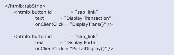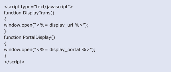 At the beginning of the layout code, I added the JavaScript code DisplayTrans() and PortalDisplay() for the SAP transaction and Portal iView URLs (Figure 13). I also used the function window.open to open the URL for the SAP screens in a new window.
