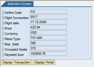 After these two lines, create a frame (TabStrip) with three fields: Carrier ID, Connection ID, and Flight Date for your selection screen (Figure 7) for this example. This helps familiarize you with how to work within the BSP and how the system passes data between pages when using the Page with Flow Logic option. If you are familiar with BSPs, then you can jump to step 6 “Call the SAP Screen via a shortcut or portal iView