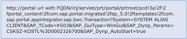 - &SAP_Dynp_Params=CSKSZ-KOSTL%3D0002326700 is the parameter that you are passing to the portal screen. CSKSZ-KOSTL is the name of the field appearing on the KS03 transaction Selection Screen. Use %3D instead of the equal (=) sign to pass data to the screen.