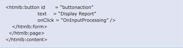 At the end of the layout code, define the Display Report button to process the data from the three fields and to show the output on the result page (Figure 8).
