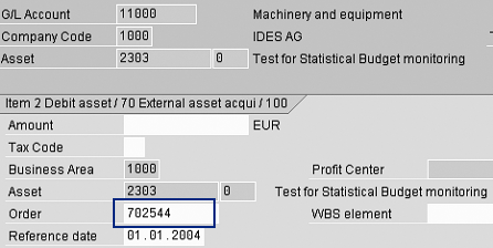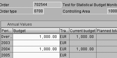 Step 4. Post budget values to the internal order. Figure 11 shows the budget provision of €1,000 for the year 2004 against order 702544.