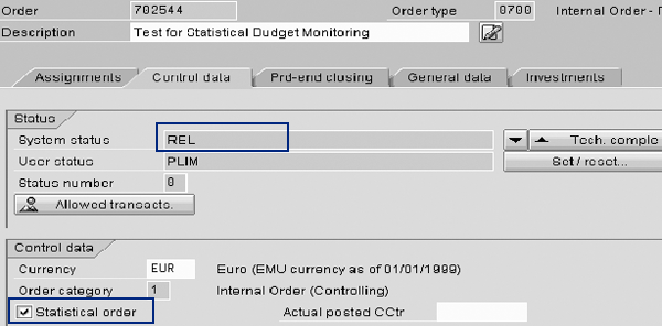 Step 1. Create an internal order and mark it as statistical. In transaction KO01, create an internal order in the Control data tab and mark it as statistical by clicking on the Statistical order check box. Then release the internal order by clicking on the Release button next to the System status column. This changes the System status of the internal order from created to released (REL) in Figure 5. After you’ve released the internal order, it can then accept FI postings.