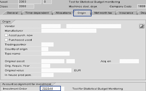 Step 2. Create asset master data. Use transaction AS01 and update the internal order by entering the internal order (702544 in this example) in the Investment order field in the Origin tab of the asset master data, as shown in Figure 6.