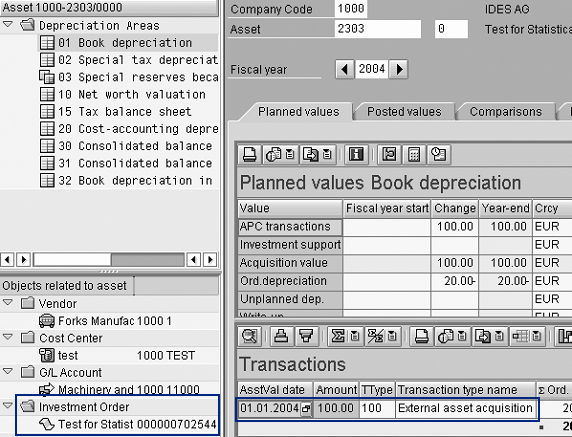 See the posted values in Asset Explorer (transaction AW01N) for asset 2303 (Figure 9). The system shows the investment order as a related object because the internal order is in the asset master data as shown in step 2.