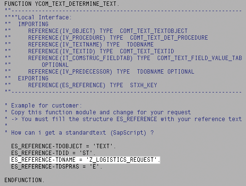 Step 6. Edit the function module source code. Now launch transaction SE37, enter YCOM_TEXT_DETERMINE_TEXT into the Function Module field and click on the Change button. This is the function module that the system uses when calling the template at the time the text type is selected on the user's interface. Within the Source Code tab only modify the value indicated in Figure 10 to instead call your text template. Save your changes and then click on the activate icon to activate the program.