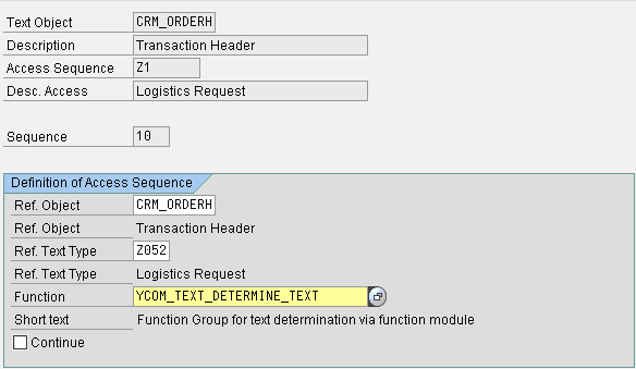 Step 7. Create a new access sequence and assign it to your text determination procedure. This ensures that the system calls the appropriate function module and template. Follow IMG menu path Customer Relationship Management>Basic Functions>Text Management>Define Text Determination Procedure.