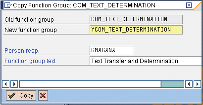 Step 2. Define the template for this text type. Use transaction SE80 and create a new function group to enable template processing. Right-click on the COM_TEXT_DETERMINATION folder and select Copy from the context menu (Figure 5). Rename the function group as YCOM_TEXT_DETERMINATION and click on the Copy button (Figure 6).