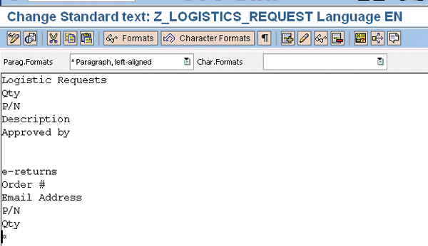 Step 5. Define the template to be called by the function module. Go to transaction SO10 (standard text: request). I am building a new template to support my text type customizing, so next I must construct the text that makes up the template shell. Enter the Text Name used to classify the type of text to be used. In my example this is Z_LOGISTICS_REQUEST (Figure 8). The Text ID represents how you use the text (e.g., ST is used for user-specific texts). The Language field determines how the system displays the text.