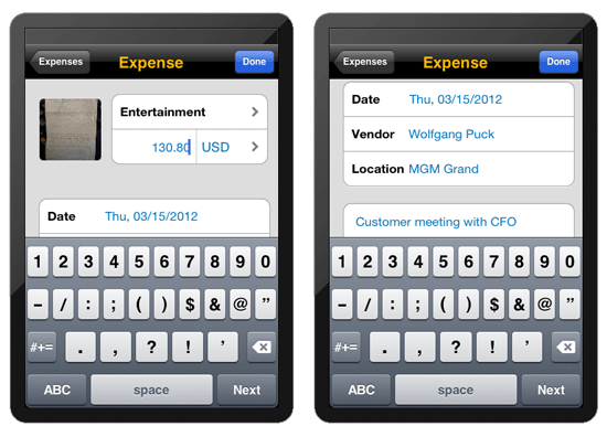 The iPhone app allows travelers to capture details about a travel expense item, including a photo of the receipt