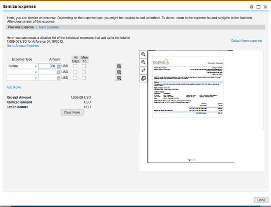 For all receipt line items, including those that come from credit card feeds, you can still attach images, such as photos or PDF documents, and add comments. In addition, you can itemize bills. For airline expenses, this process may involve breaking out the flight costs from the travel agent booking fees; for hotel expenses, you need to separate room charges from meals (Figure 10).