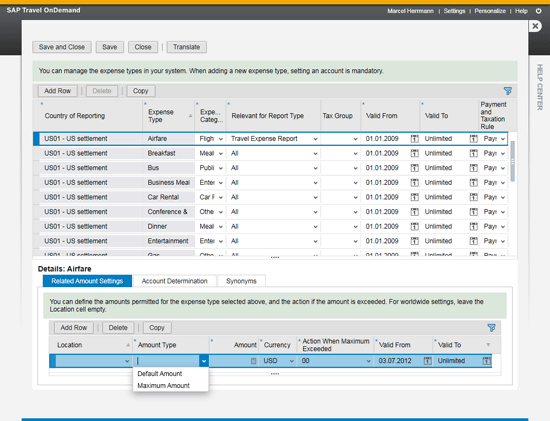 - The Related Amount Settings tab provides you with these options that you can set, by expense type: Location, Amount Type, and Action When Maximum Exceeded. The Location option enables you to determine, by country, a different maximum amount allowable for an expense type. In the Amount Type field, you can define a default amount — for example, for a per diem or for a maximum amount that you want business travelers not to exceed. With the Action When Maximum Exceeded option, if you have chosen to enter a maximum amount, you can determine the system action when a business traveler exceeds that amount. Options include displaying a warning message; a hard error that does not allow a traveler to expense an amount above the maximum; and the requirement for the traveler to maintain a reason for exceeding the maximum amount.