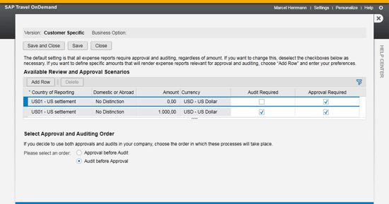 You can also determine the types of approvals and audits that are required for expense reports using the configuration option Set Approval and Auditing Conditions for Expense Reports (US) on the Settings menu. Figure 12 shows the configuration that sets both an audit and an approval as required for expense reports that exceed $1,000. In addition, when both an audit and an approval are required, you can determine which takes place first, depending on legal, industry, or company requirements.