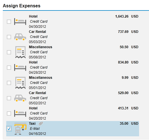 After you add the receipt, you receive an email confirmation from the SAP Travel OnDemand system. If you have not yet created an expense report, the receipt is placed into a list of unassigned expenses (Figure 3). This is the same list in which expense items from the credit card feeds are shown. If an expense report has already been created for the date range of the receipt, it is automatically assigned to that expense report.