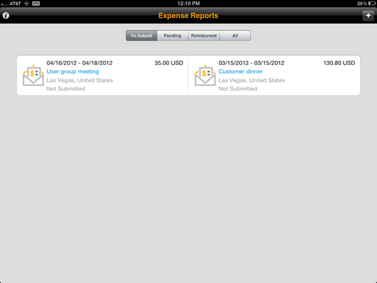 Expense reports that have not yet been submitted for reimbursement are shown on the initial screen of SAP Travel OnDemand on the iPad app