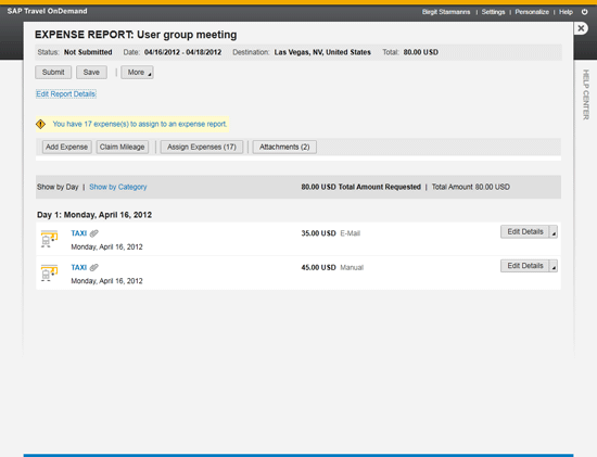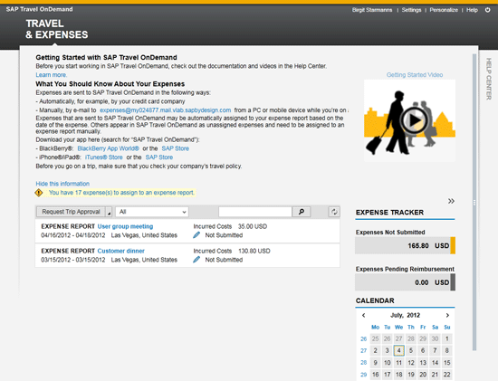 Finally, you can create expense reports, including line items, using Web browser access to the SAP Travel OnDemand solution. The Home page is shown in Figure 7.
